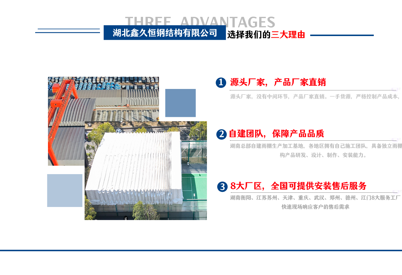 湖北鑫久恒鋼結(jié)構(gòu)有限公司是一家電動(dòng)雨棚、膜結(jié)構(gòu)車棚研發(fā),生產(chǎn)銷售,施工安裝于一體的專業(yè)鋼結(jié)構(gòu)科技公司,主要產(chǎn)品有伸縮雨棚,電動(dòng)雨棚,膜結(jié)構(gòu)車棚等。 湖南地區(qū)職員目前有80多人,占地面積20000平方米,廠房面積15600平方米,配備先進(jìn)的生產(chǎn)流水線,使每件品質(zhì)產(chǎn)品的堅(jiān)實(shí)基礎(chǔ)。 公司在蘇州、天津、重慶、武漢、德州、烏魯木齊、江門均設(shè)有服務(wù)工廠,總?cè)藛T共300多人,擁有專業(yè)的技術(shù)團(tuán)隊(duì),配備先進(jìn)的設(shè)備和流水線生產(chǎn),產(chǎn)能高,貨源充足,發(fā)貨速度快,服務(wù)區(qū)域廣。 移動(dòng)伸縮棚適用于通道臨時(shí)倉儲(chǔ)、戶外運(yùn)動(dòng)遮陽、污水池遮蓋、能源交通、熱力化工、礦山、船舶制造及市政建設(shè)、物流、碼頭等領(lǐng)域的構(gòu)件制作加工,成品半成品存放、倉庫、野外儀器設(shè)備操作用房等。尤其是對(duì)工廠發(fā)貨、倉儲(chǔ)臨時(shí)遮雨防嗮,梅雨期較長(zhǎng)、建設(shè)周期較短的工程施工等特別適用。還可根據(jù)用戶需求量身定制、適合企業(yè)所需不同款式的產(chǎn)品。 我公司堅(jiān)持“誠(chéng)信社會(huì)為本,客戶滿意為榮”的經(jīng)營(yíng)理念,做到質(zhì)量把控,嚴(yán)格管理,精益求精,恪守承諾。使鑫久恒逐步走向成熟,其系統(tǒng)化、專業(yè)化日趨完善。以專業(yè)的技術(shù)、科學(xué)的管理,更高的產(chǎn)品質(zhì)量,優(yōu)良的企業(yè)信譽(yù),真誠(chéng)的客戶服務(wù),靈活多樣的經(jīng)營(yíng)方式和務(wù)實(shí)創(chuàng)新的企業(yè)精神愿與社會(huì)各界攜手合作,為推動(dòng)智能鋼結(jié)構(gòu)建筑事業(yè)的發(fā)展而不斷努力。...